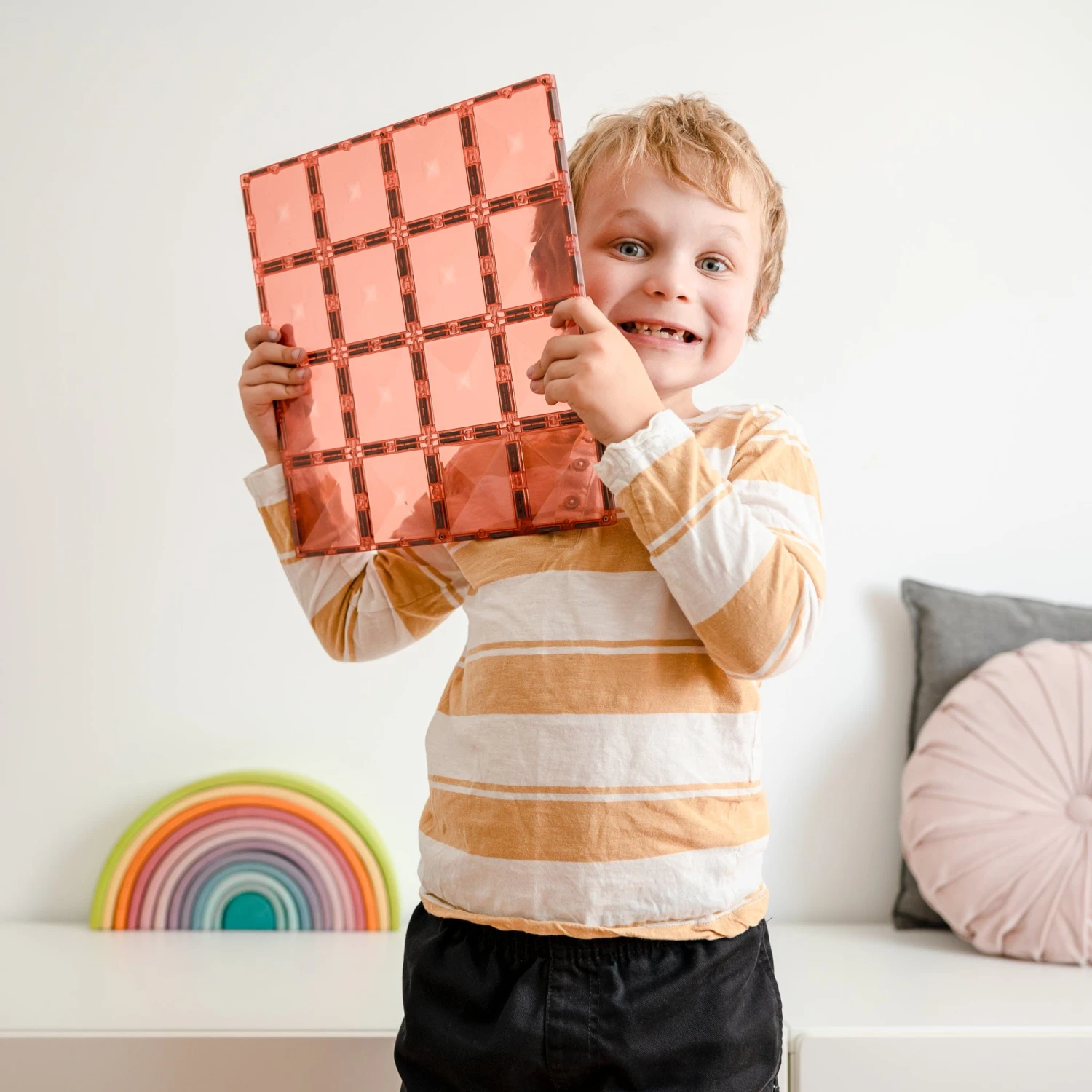 When it comes to magnetic tile play, it’s all about that base! Help children bring to life their inspired ideas and build twice as tall with our 2 piece Base Plate Pack, featuring one lemon and one peach 30cm x 30cm powerful magnetic building plate!