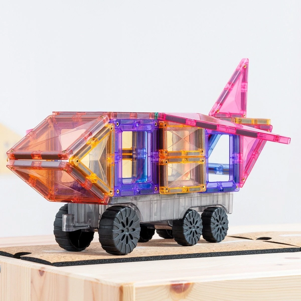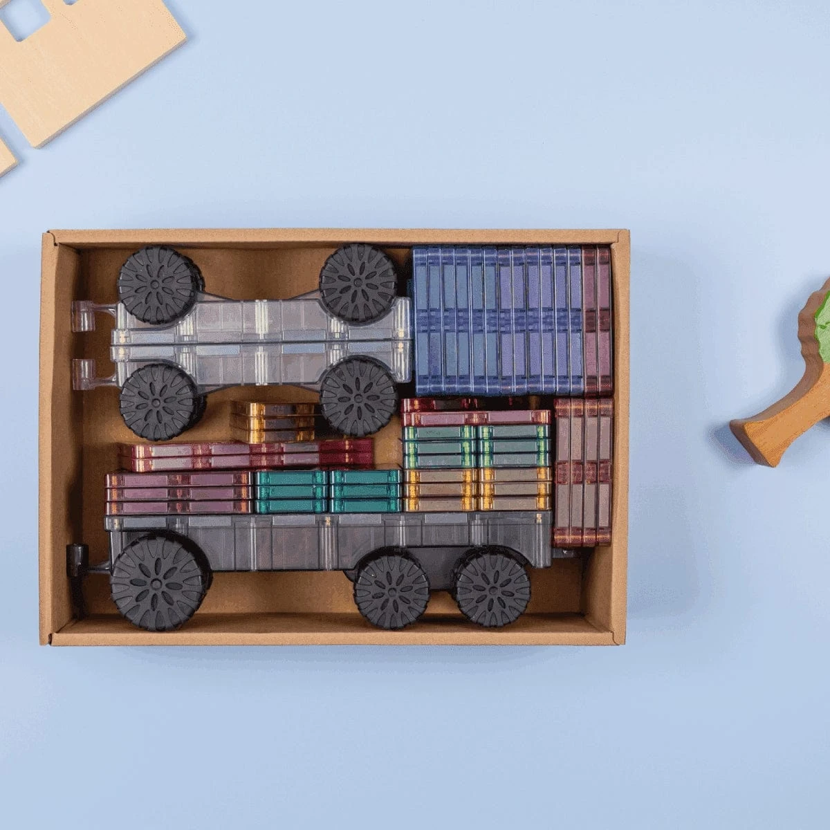 Designed with vehicle enthusiasts in mind, this pack takes magnetic tile play up a gear! Featuring our iconic REVERSIBLE transport base in light grey, two clear motion bases with REAL rubber wheels, plus a range of magnetic tile shapes, the CONNETIX 50 Piece Pastel Transport Pack allows you to imagine and create endless vehicle designs. It also expands the range of colours children can explore with eight pastel colours in hues of pink, berry, peach, mint, emerald, lemon, violet and sapphire.ย ย