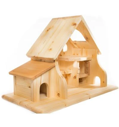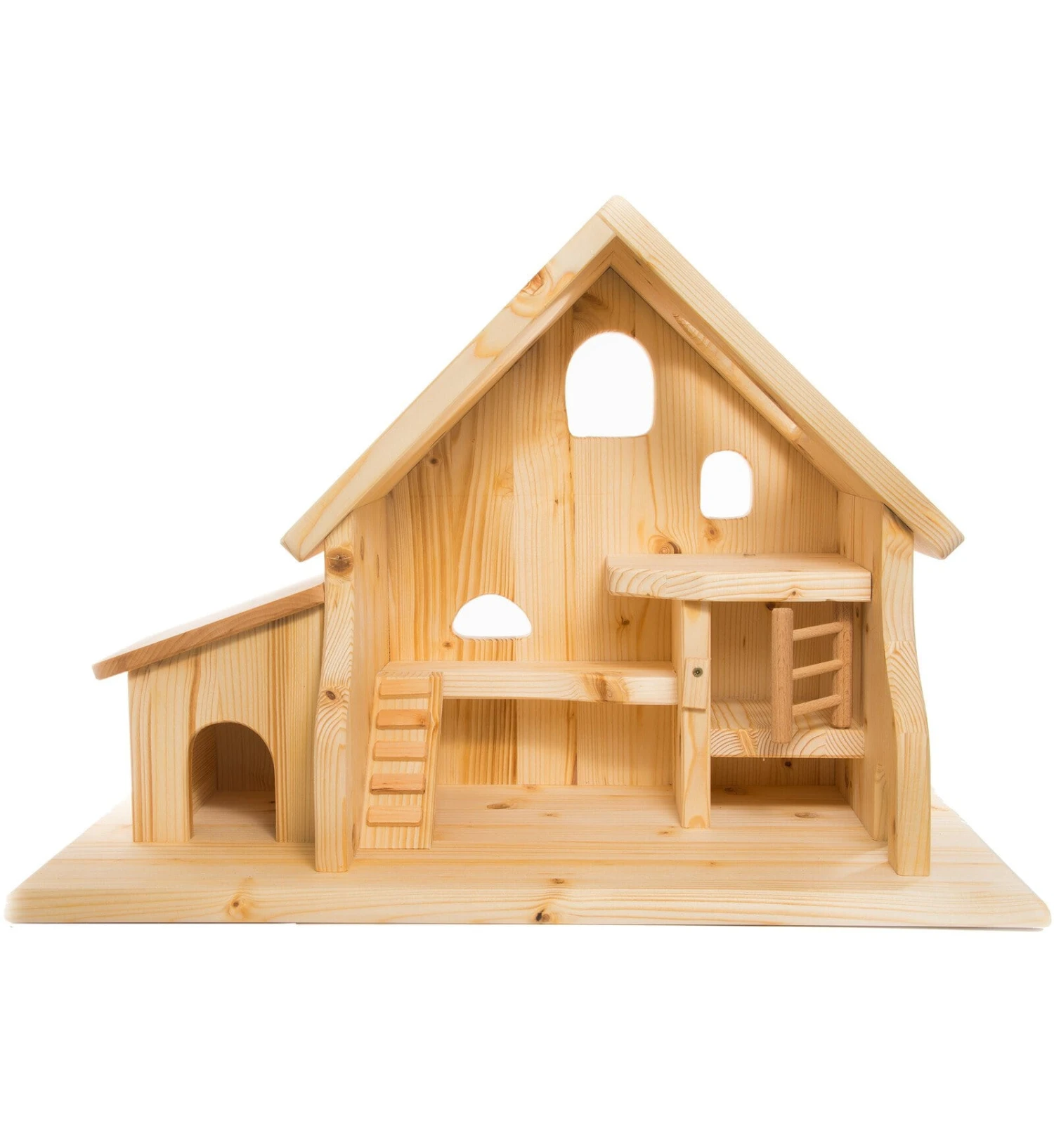 A downstairs barn area with a second storey suitable for storage other small animals or a living space. An outhouse chicken coop or dog kennel adjoins the main structure.