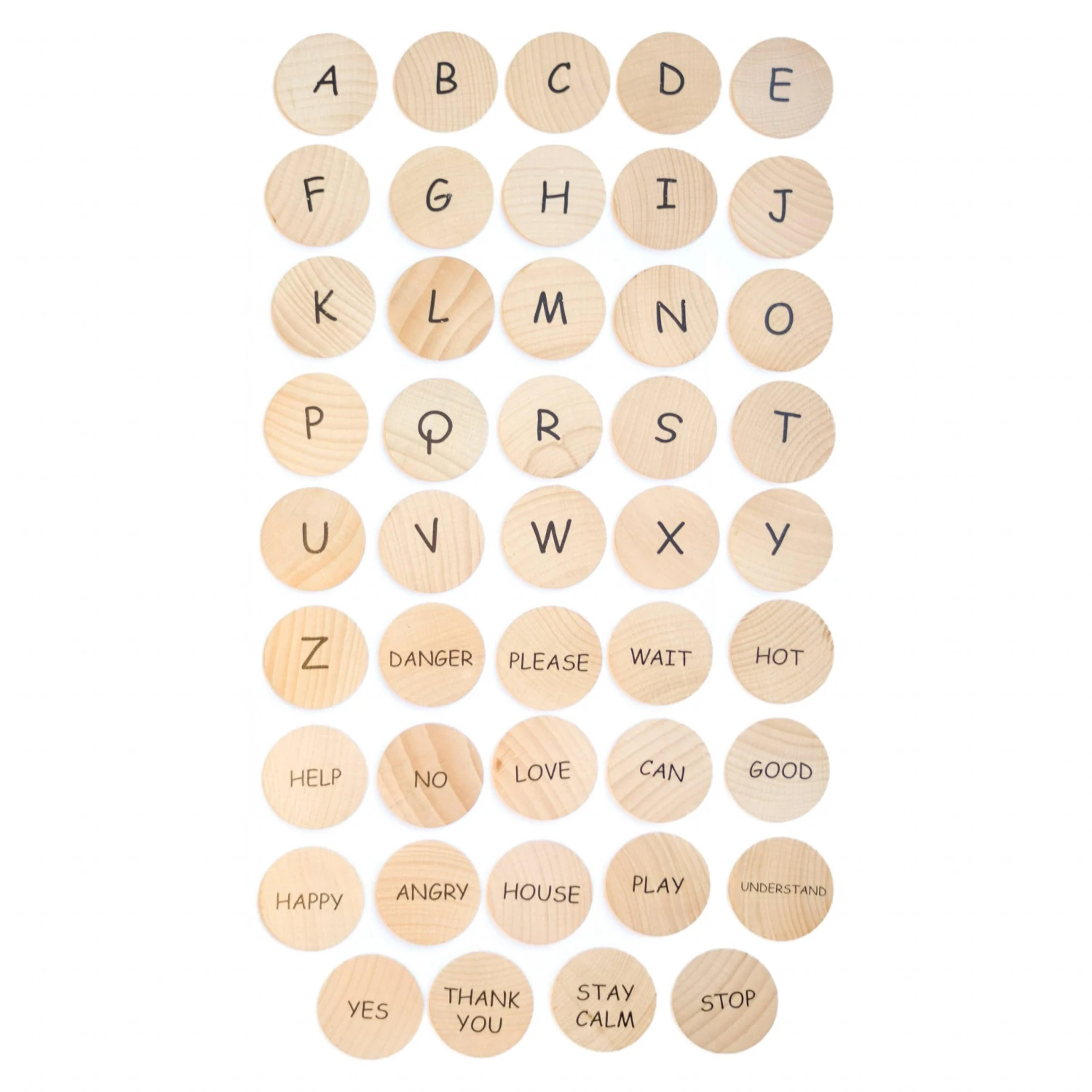 Sign Language Wooden Discs are a valuable resource in any home or early learning center. This 44 piece set is a fun way to encourage children to learn sign language. It is also a great toy to open conversations about inclusion and the different ways people communicate. This set includes all the signs of the alphabet and commonly used words such as please, no and happy. With one side of the disc showing the sign and the other side showing the letter or word. A fun way to introduce sign language while encouraging children to feel positive and confident while they learn through play.