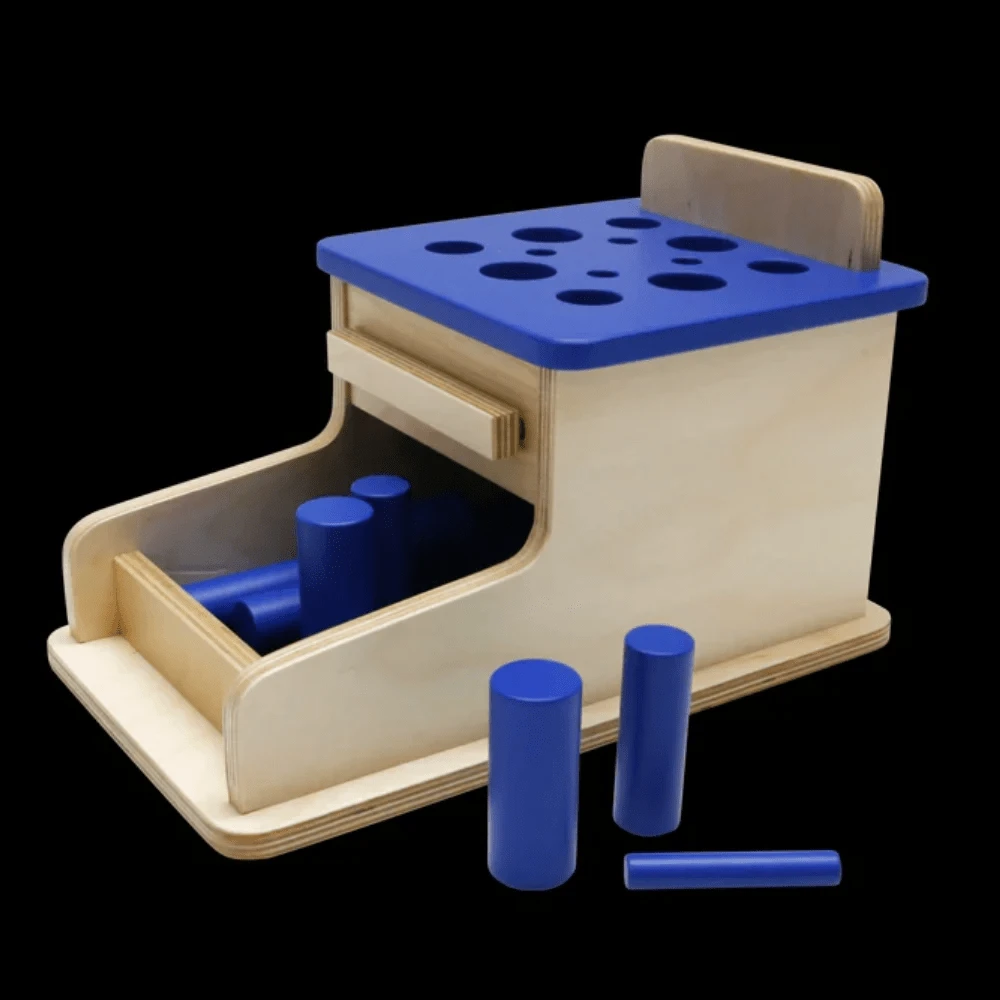 A box with a lid with 12 cut-out holes. The child inserts the cylinders in the correct holes to fit the sizes.