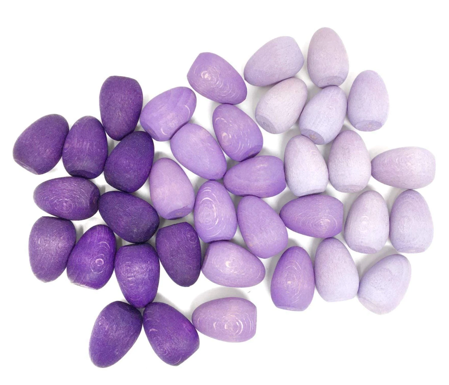 This Grapat mandala eggs include 36 small wooden eggs in 3 shades of purple. The Grapat eggs measure 2cm in height.