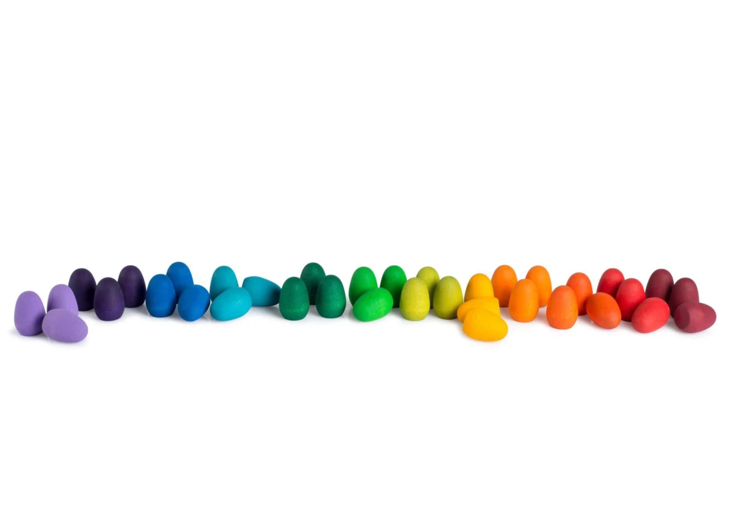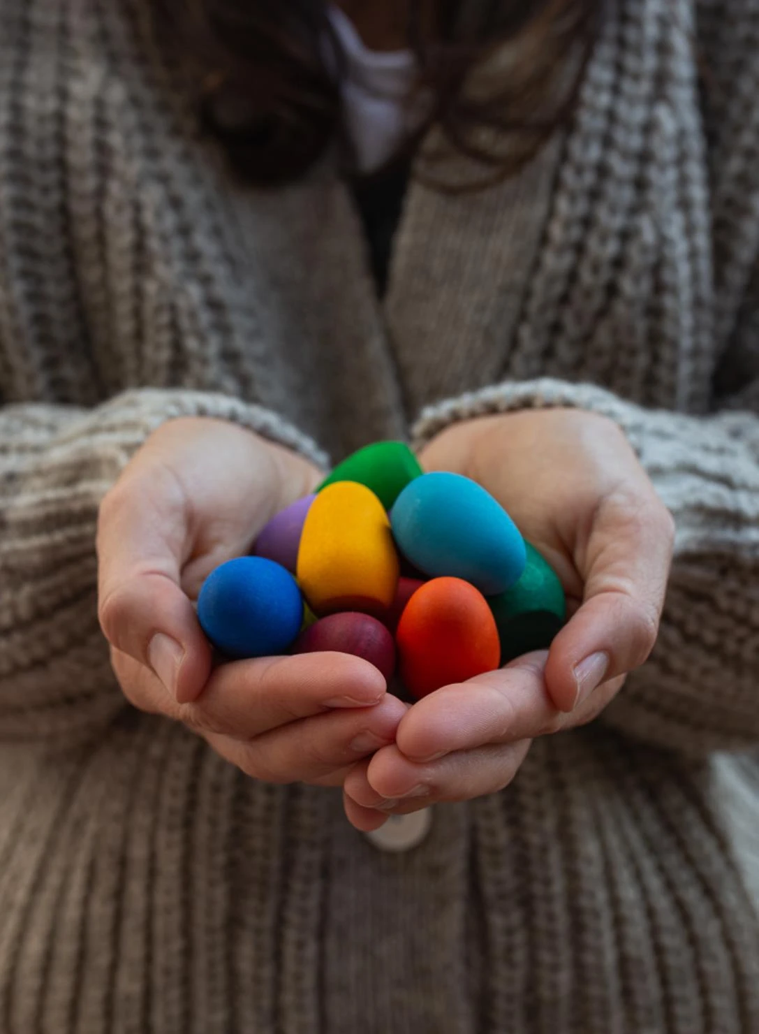 The Grapat Mandala Rainbow Eggs set of 36 little eggs in twelve different colours is a superbly versatile, open ended, loose parts wooden toy and the possibilities of use are so exciting! Designed in order to create a unique sensory experience as you design your own mandala, this also encourages the development of fine motor skills and becomes a beautifully interactive way to teach children about symmetry.