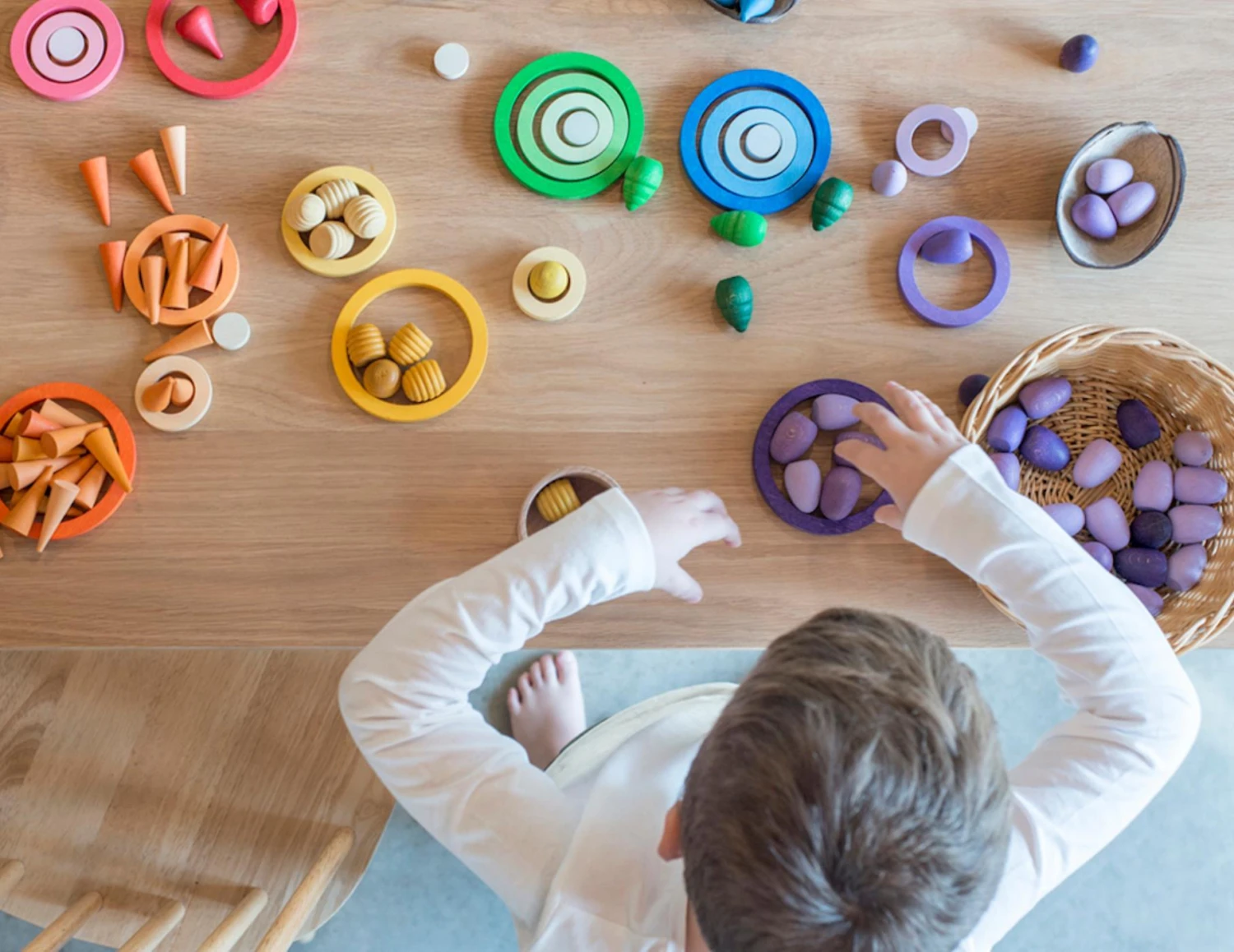 The 24 rings are an open ended exploratory wooden toy, whereby the child is invited to discover and experiment with these loose parts.