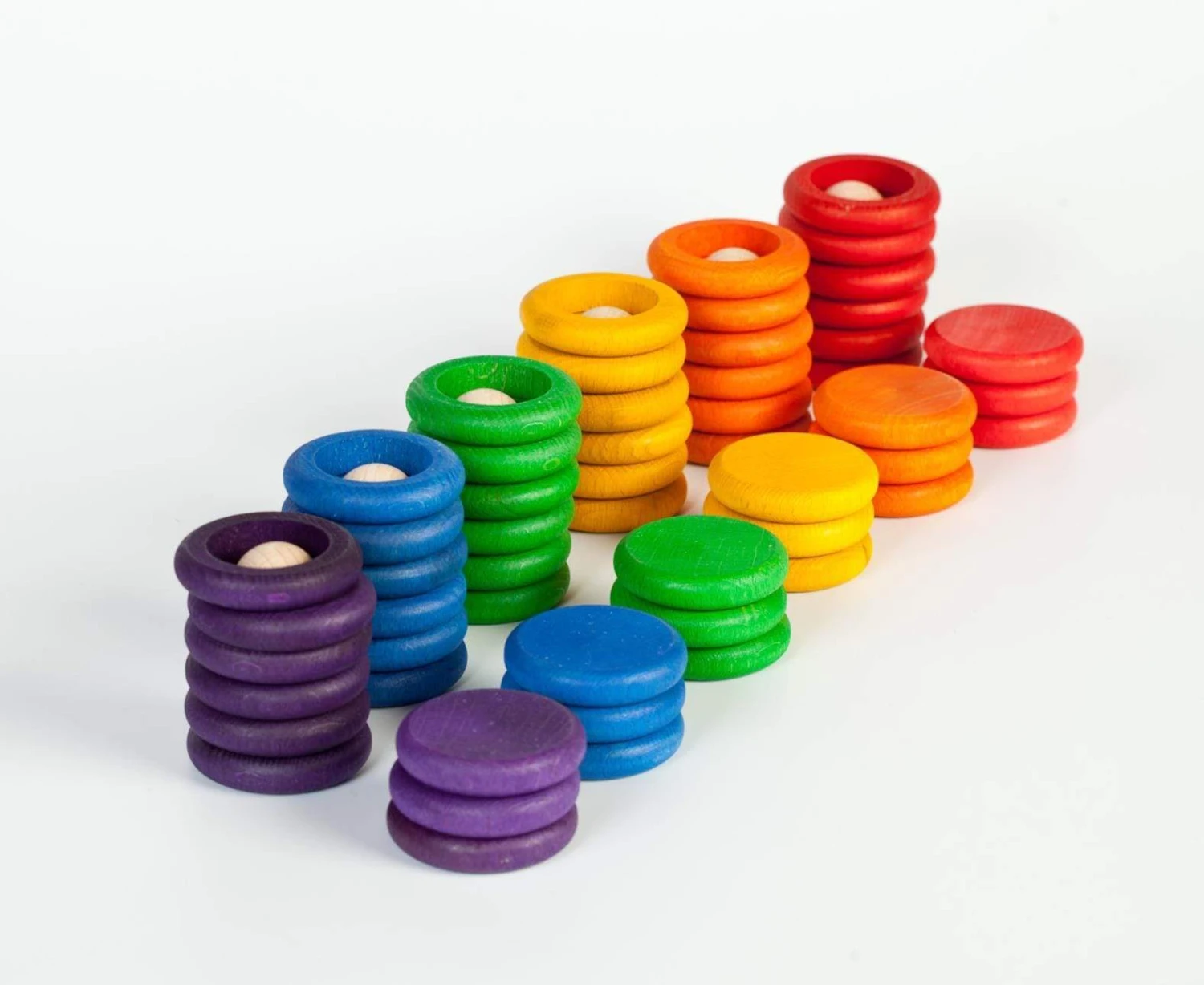 This Grapat Nins, Rings and Coins include 66 pieces of 6 Nins, 24 Coins and 36 Rings in 6 rainbow colours (Includes Cotton Bag). The Nins measure 6cm in height and the coins & rings are approximately 4.7cm in diameter.