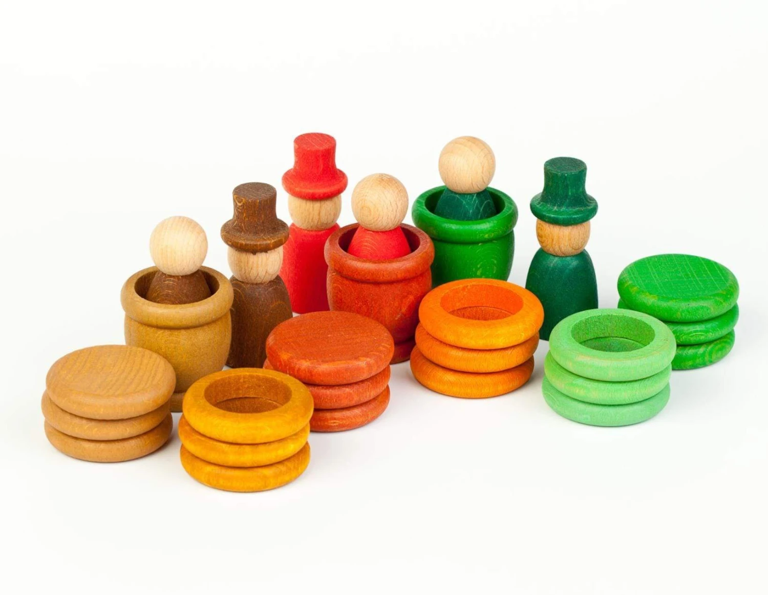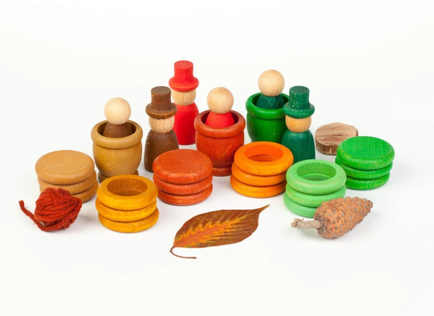 The Grapat Seasons Autumn set contains 27 carefully collated wooden pieces with reference to the colours and sentiment of Autumn. Include 3 Nins, 3 Nins with top, 3 mates, 9 rings, 9 coins. The Nins measure 6cm in height, the mates measure 5cm in height], the coins and rings are approximately 4.8cm in diameter.