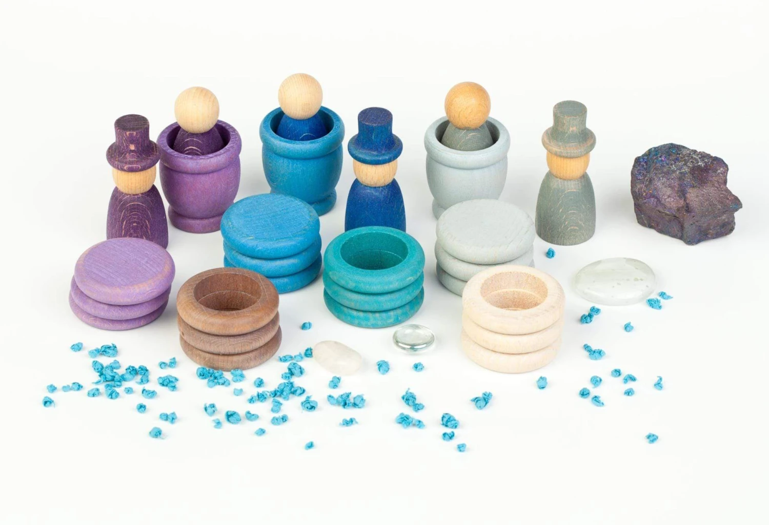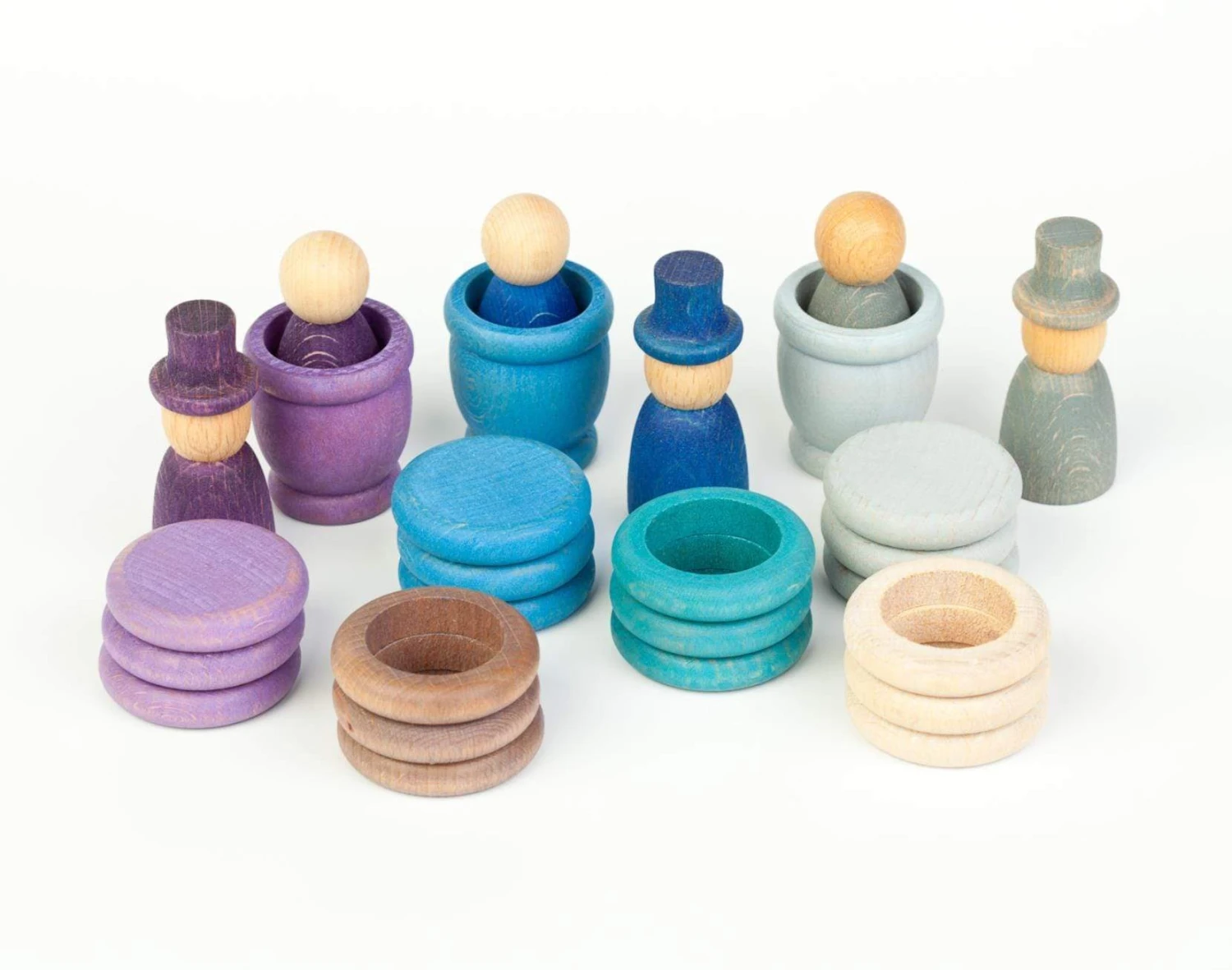 Grapat Seasons Winter set contains 27 carefully collated wooden pieces with reference to the colours and sentiment of Winter. Includeย 3 Nins, 3 Nins with top, 3 mates, 9 rings, 9 coins. The Nins measure 6cm in height, the mates measure 5cm in height], the coins and rings are approximately 4.8cm in diameter.