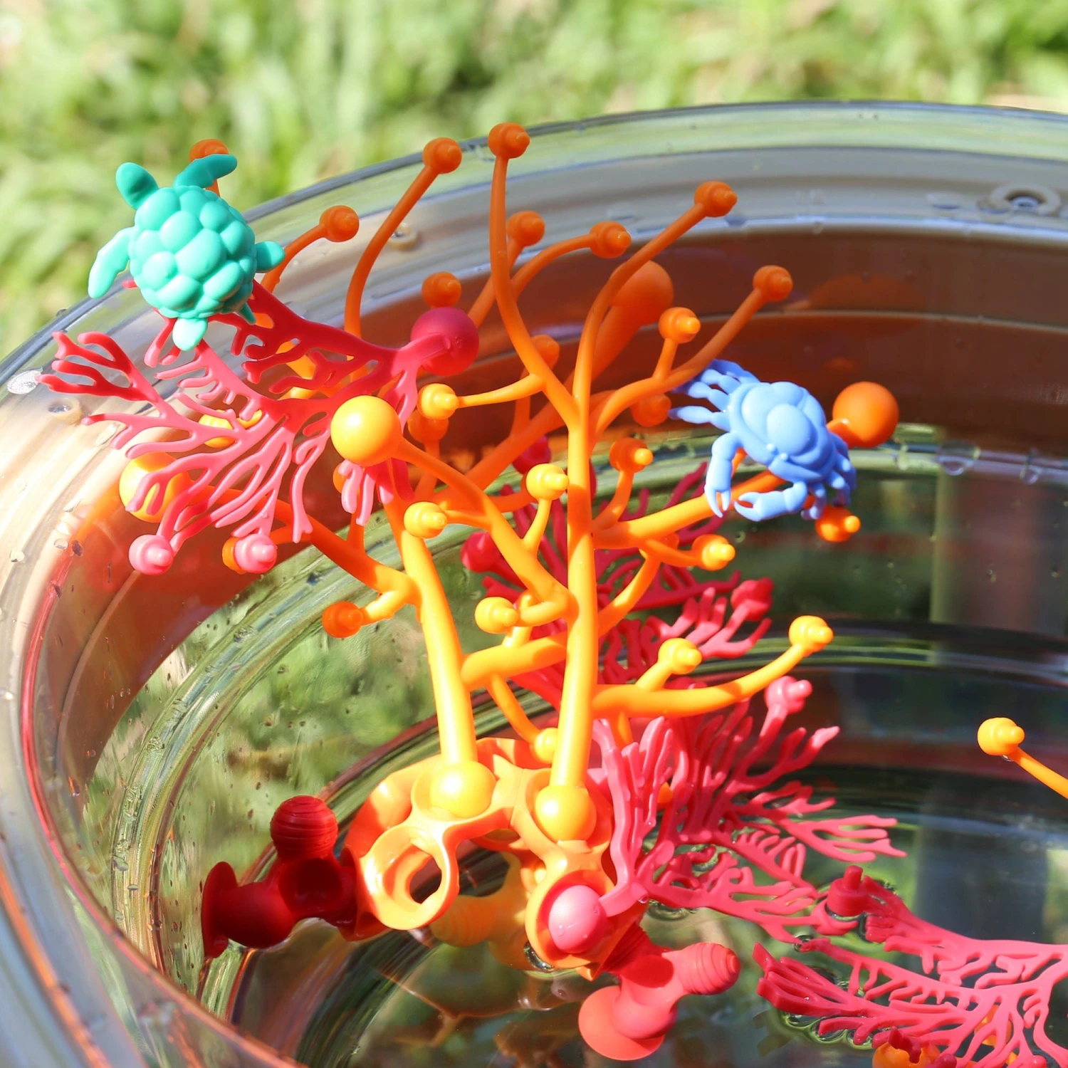 Based upon the beauty of coral reefs, organic growth and organic connections, Coral Connections helps children create environments in a toy-based format. Soft, pliable plastic components feature snap fit and ball and joint connections to easily build horizontally, vertically or in web-like mesh. Sea creatures and a treasure chest help children build their own stories and visual and audible narratives as they construct ecosystems and form connections visually and spatially. Can be used indoors, outdoors, in sand, in water, and as a faux coral reef for real fish for STEM related activities. Integrate with arts and science lessons to extend the play-based narratives. Includes large, inspiration poster with example designs and beautiful, aquatic imagery. Store indoors. Ages 3+.