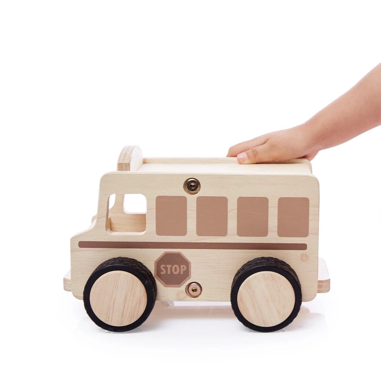 - Large birch plywood vehicle features natural-toned, screened artwork and soft plastic, non-skid wheels