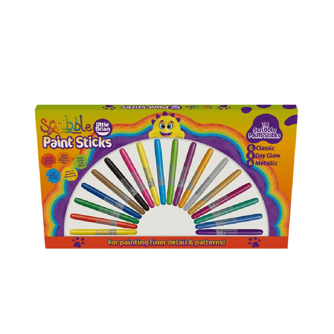 Little Brian Scribble Paint Sticks are perfect for painting finer detail and patterns! A fun, clean and very convenient way to paint. Scribble Paint Sticks twist up and down like a glue stick, and dry in less than 60 seconds. Use these silky Paint Sticks to paint on surfaces such as paper, card and even glass!