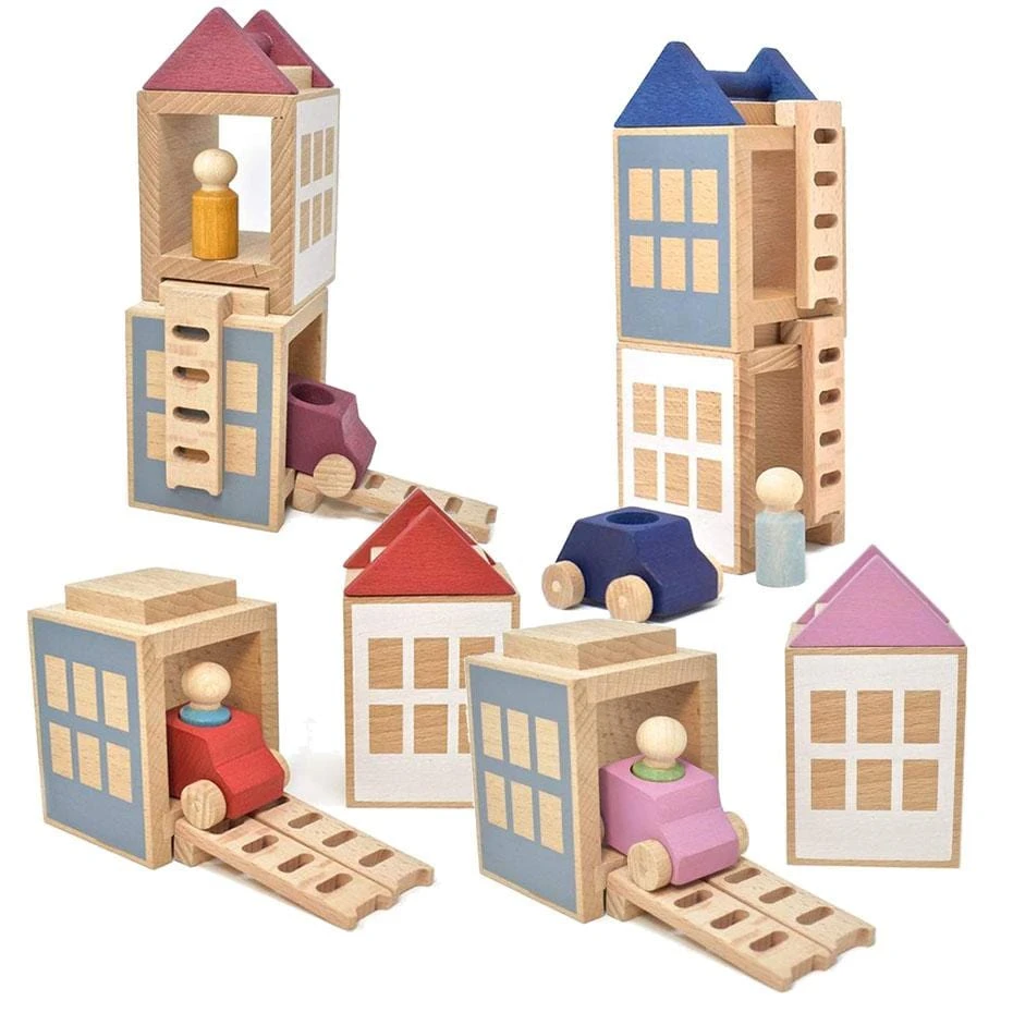 Lubulona Town Mini is a great educational and creative construction toy for boys and girls. It comes with two modular houses and two ladders, one coloured roof as well as a toy car with a wooden figure. The houses are stackable and can be placed either on top of each other or side by side. The little car fits perfectly inside the houses, which can therefore also be used as a parking space for the wooden toy car. A versatile and sustainable toy for creative kids. Made in Europe.