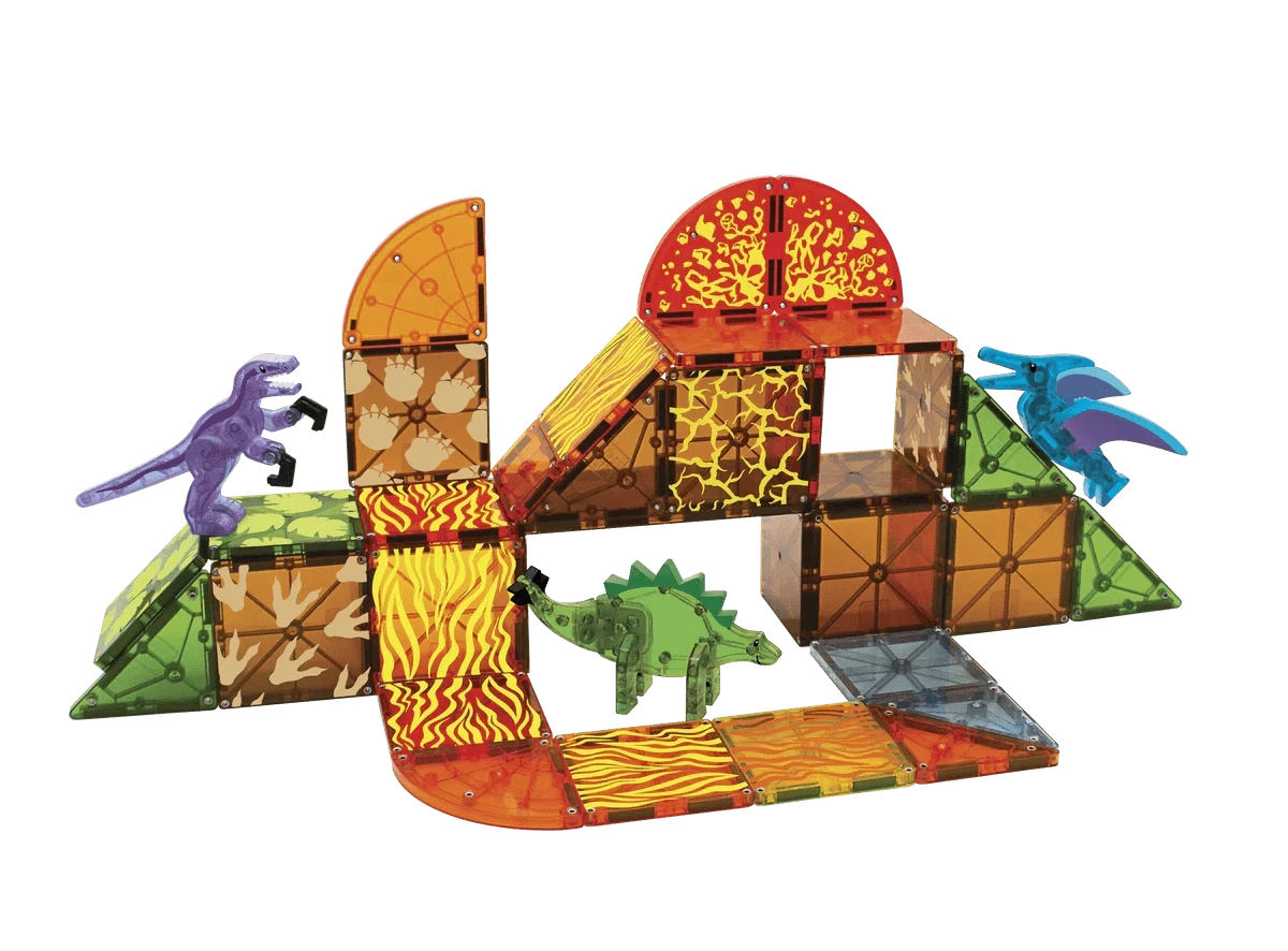 Volcanic explosions, molten lava, and ferocious dinosaurs are bursting onto the scene! The Dino World 40-Piece set features four oversized, fully-magnetic dinosaurs and brightly-coloured, volcanic-themed tiles for imaginative play potential that never goes extinct.