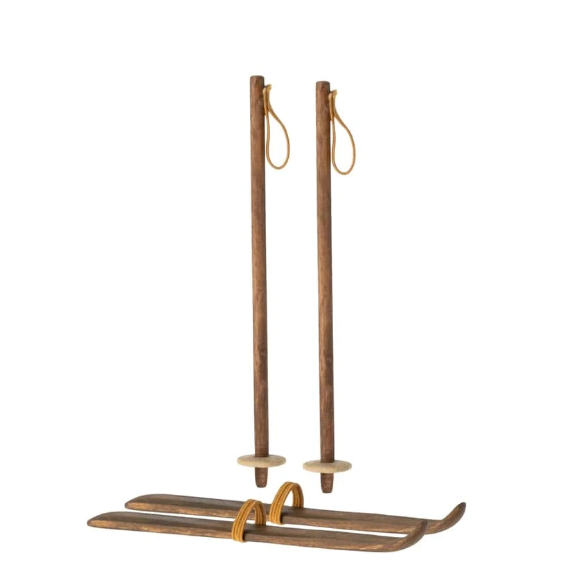 Your Maileg mum and dad mouse will enjoy a day on the slopes with this miniature wooden skiing set. The elastic band makes the skis and poles easy to attach. Measures 10.5cm in length. Also suitable for the grandma and grandpa mouse.