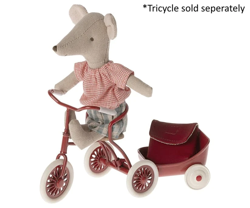 Big sister mouse is ready for a day at Maileg school, carrying her backpack. She has magnets in her hands so she can hold the handles of the tricycle for a fast trip. Measures 13cm in length.