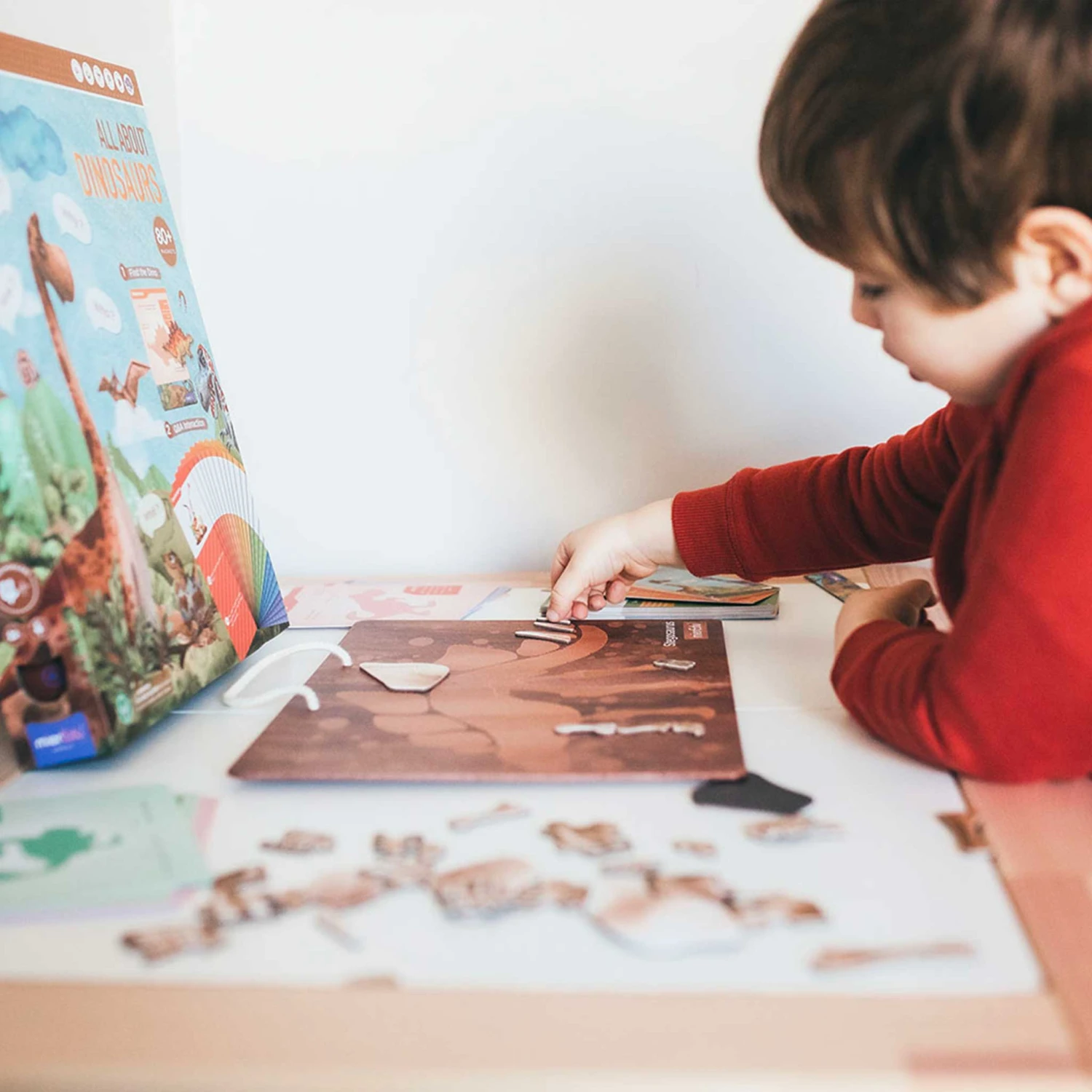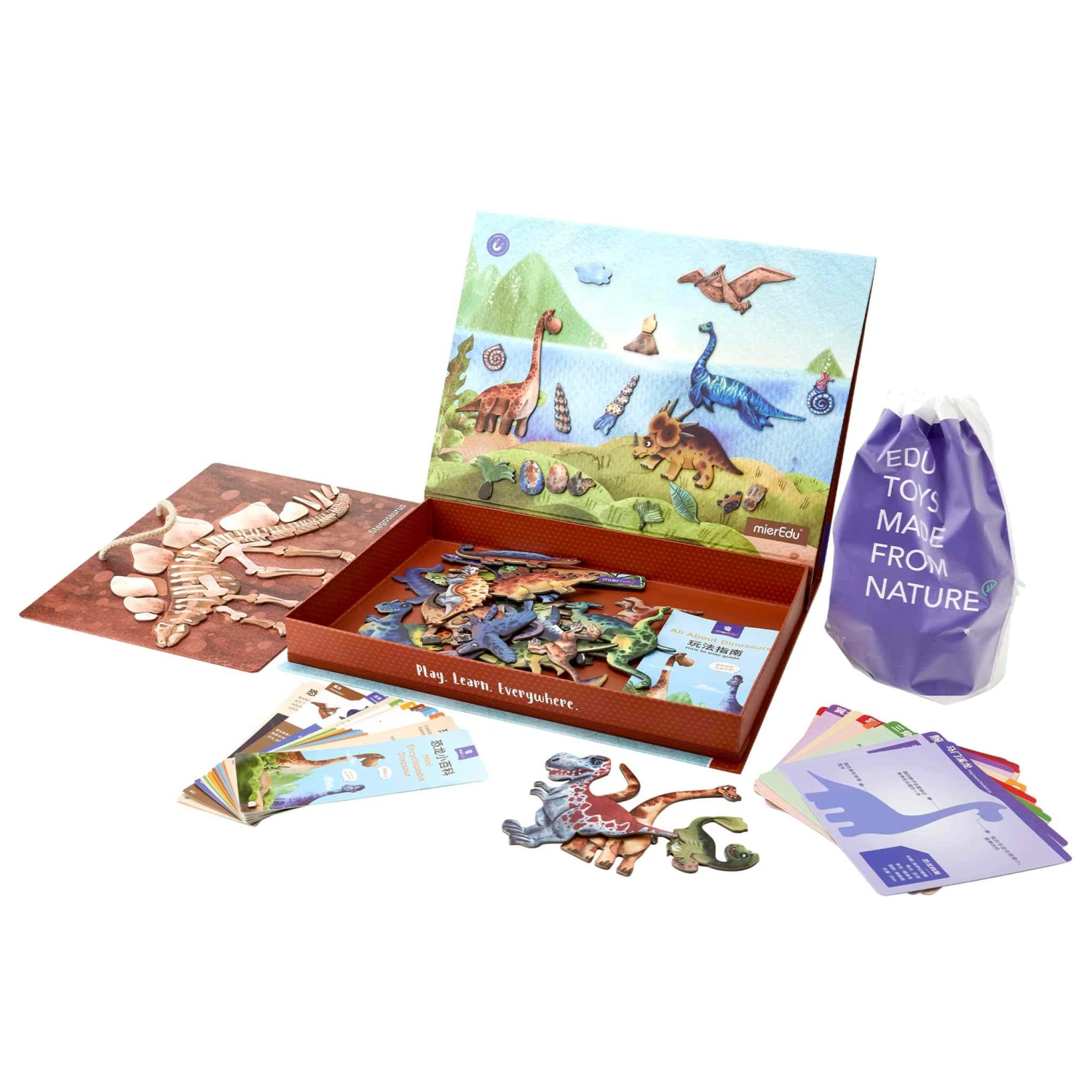 Discover the biggest creatures that ever lived on Earth millions of years ago. Play the magnetic puzzles and read the mini encyclopedia to learn all about fascinating facts of dinosaurs. Like a little Dino expert, see when & where the dinosaurs lived. What did they do every day? Reveal how the fossils were made. Put together all bones and teeth puzzles to reveal a detailed dinosaur fossil.