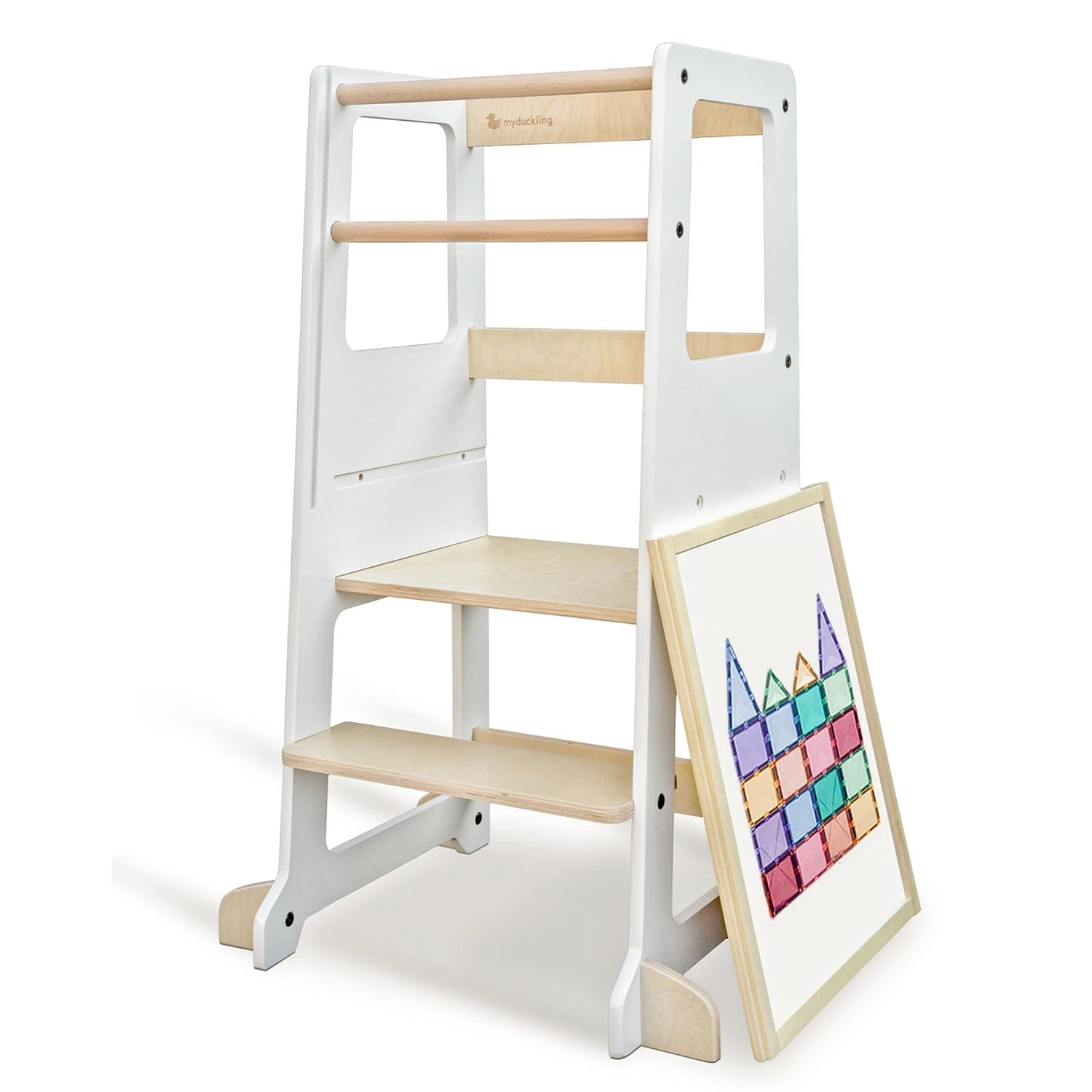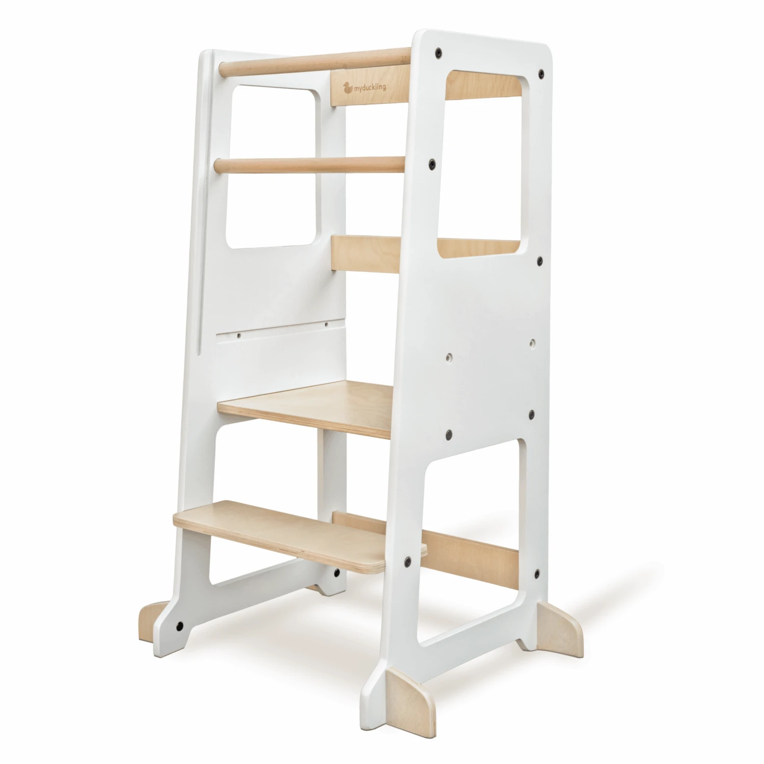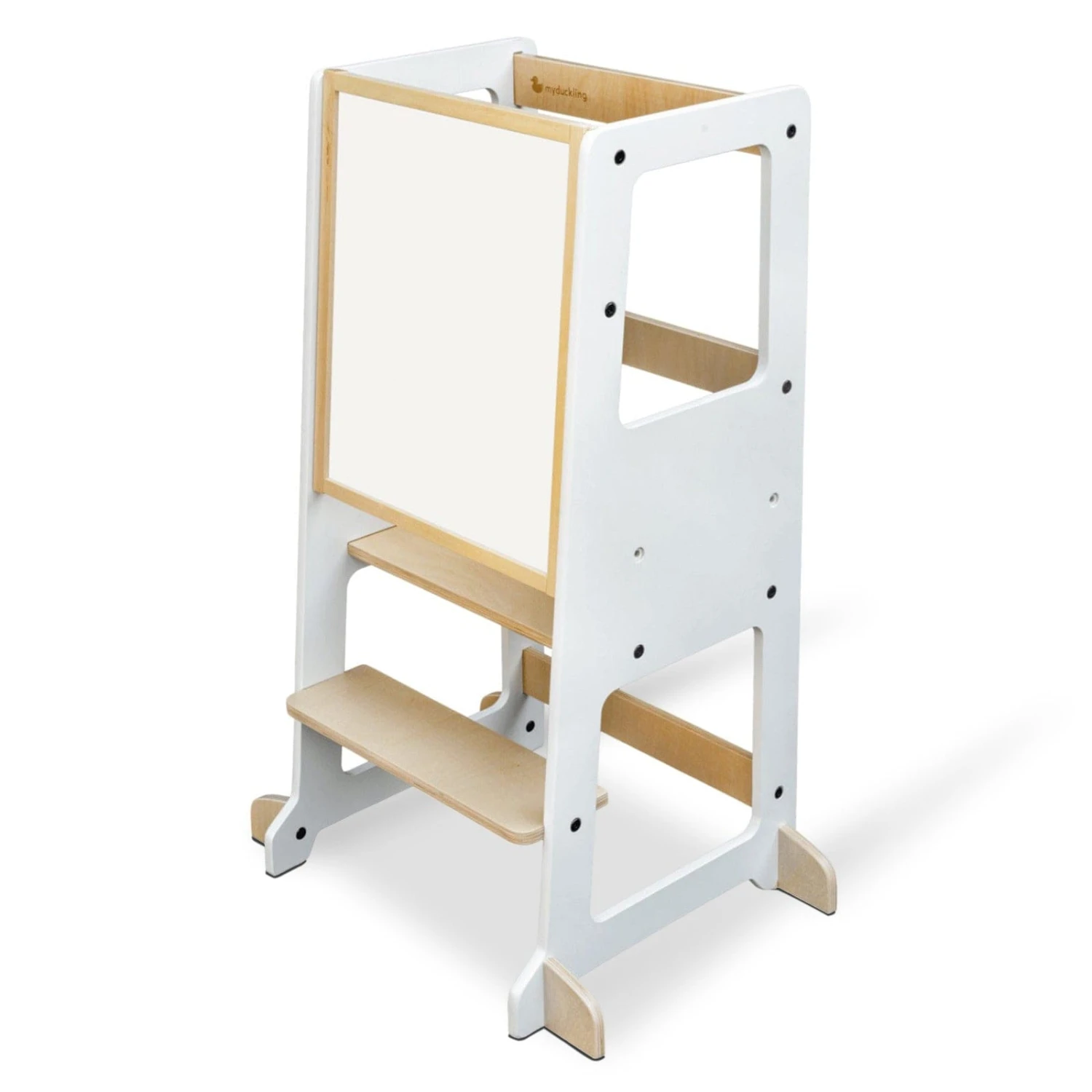 My Duckling® Adjustable Learning Tower 2in1 is uniquely designed with two built-in platform heights, supporting your child in all stages of their growth. It is equipped with an exclusive removable magnetic drawing board, on the back. Which allows your kids to use it in many day to day activities in your presence.