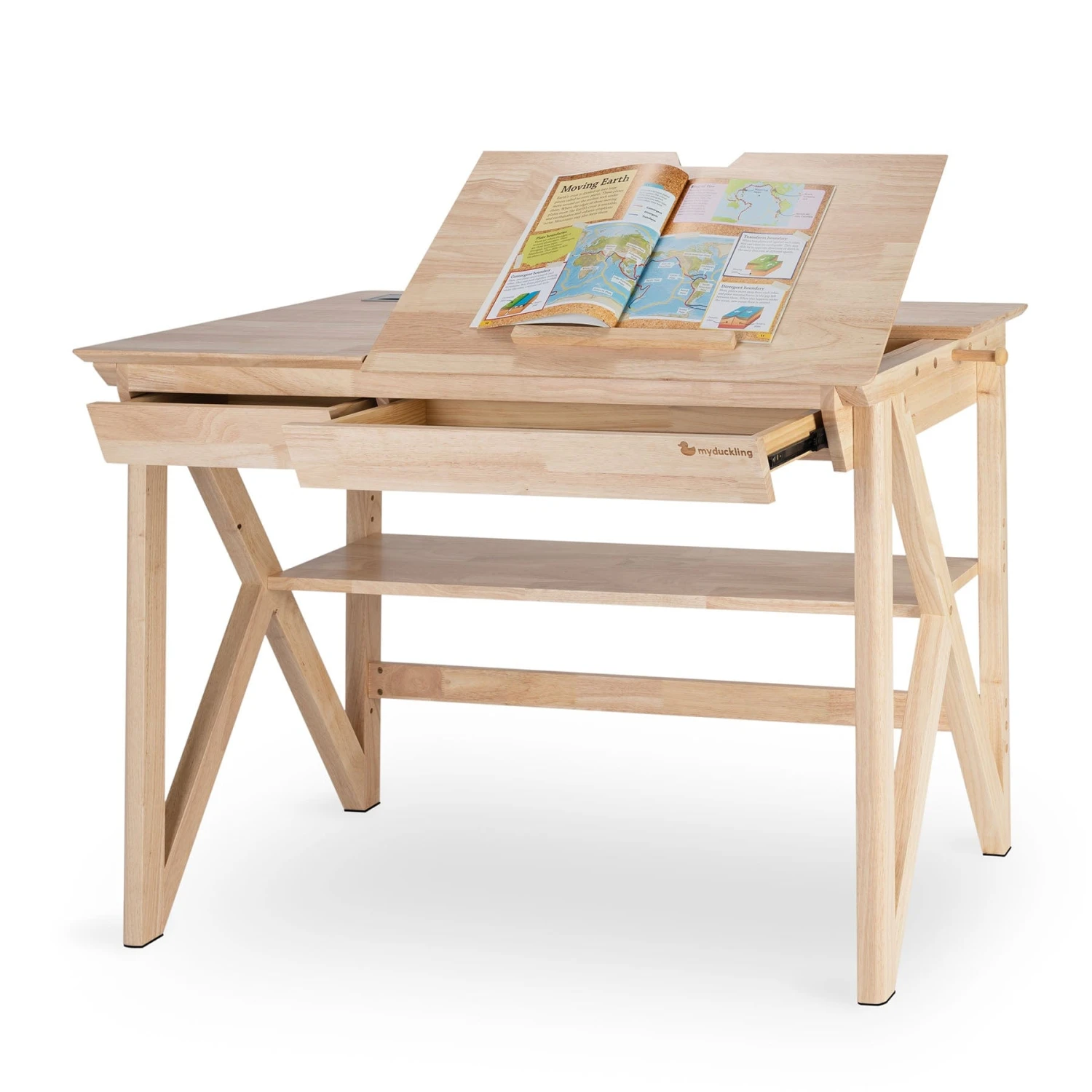 My Duckling Solid Wood Study Desk With Easelย with patented slanted board design, coupled with the 112*69 cm wide desktop, not only serves as a child’s study desk, but also grow with kids. It can also be used as parents’ desk.ย