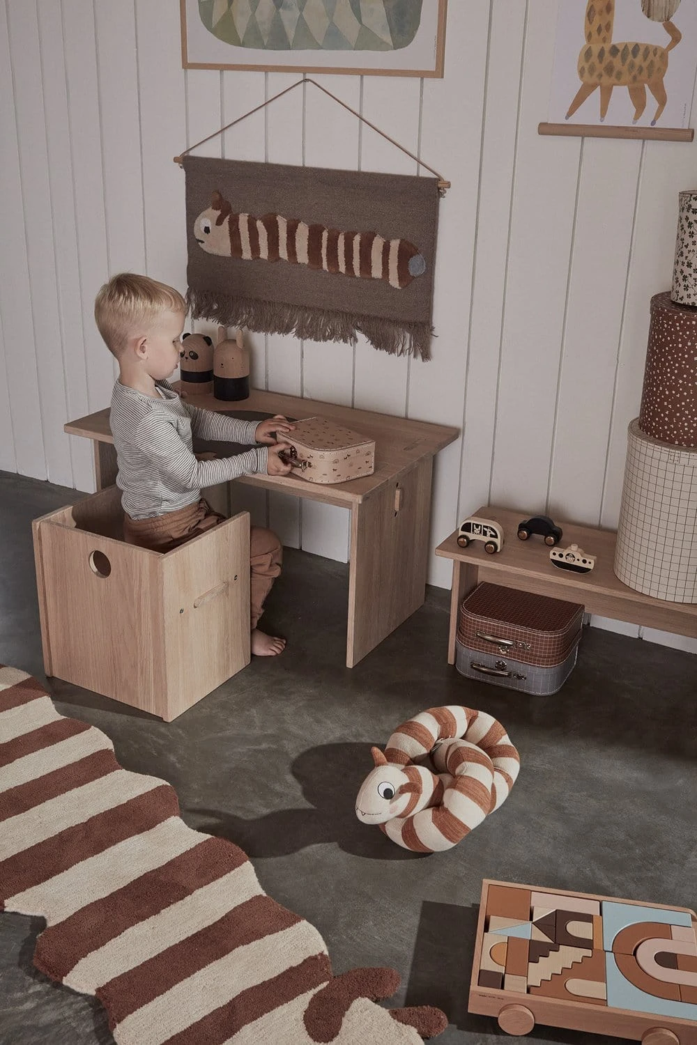 The wall rug series is a fun and playful way to decorate the children’s room. The rug is handmade in wool and cotton, and can be hung on the wall with the included stick and leather string. Hang the wall rug alone, or with other wall rugs from the series.