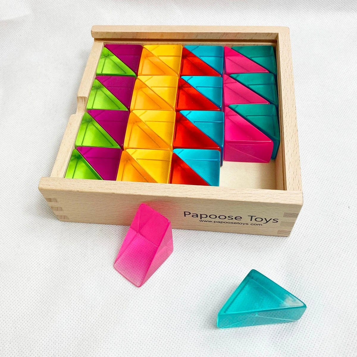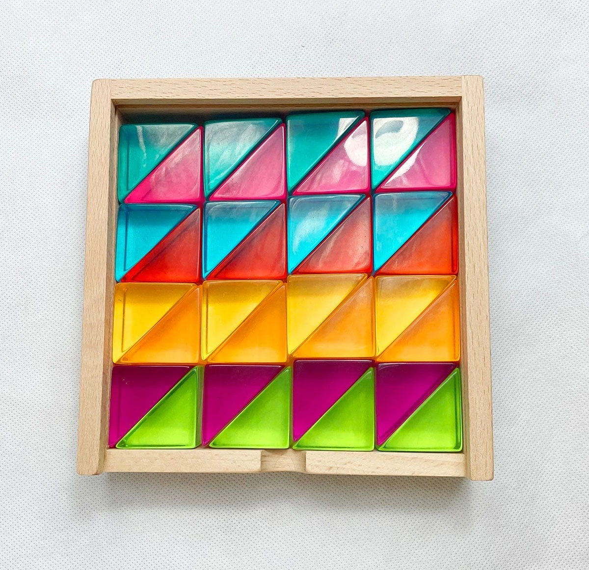 Lucite (a type of acrylic) add gorgeous luminous colour to a natural wooden block set.