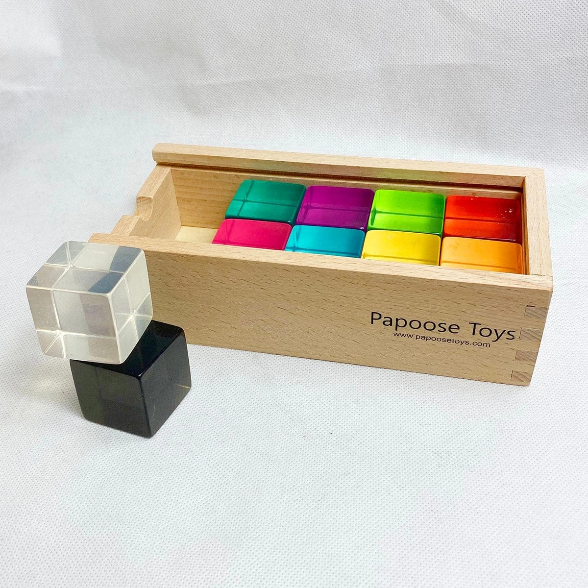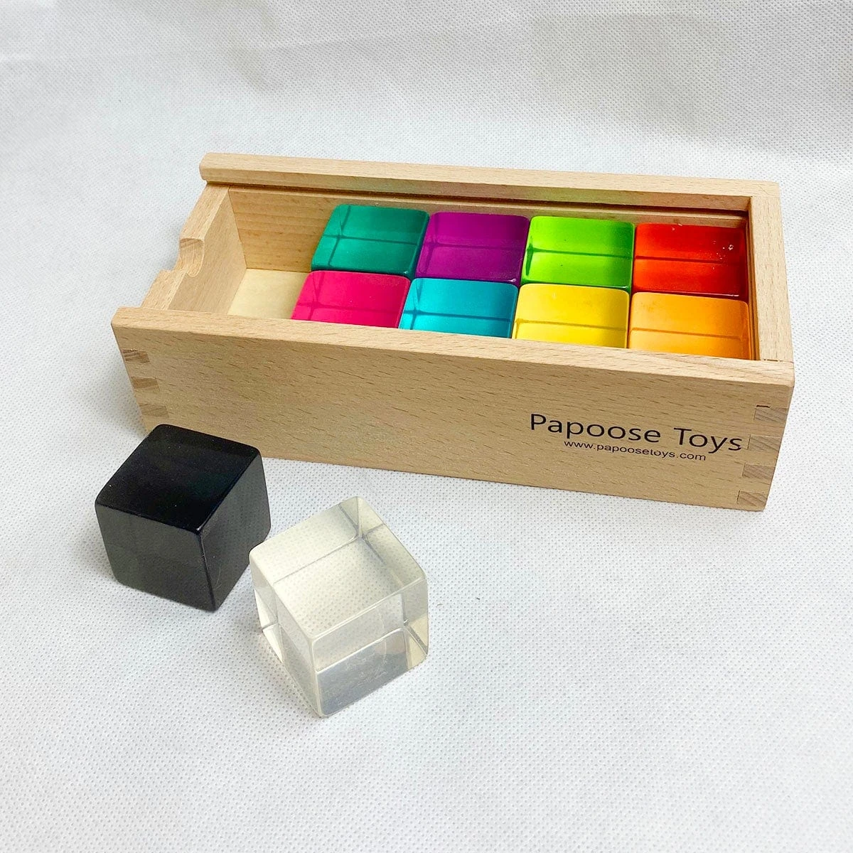 The Phatt Cubes are 3.5×3.5×3.5cm. They come in a set of 10 pieces, one each of our Papoose Bright Lucites plus Back and Clear.