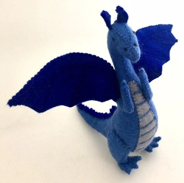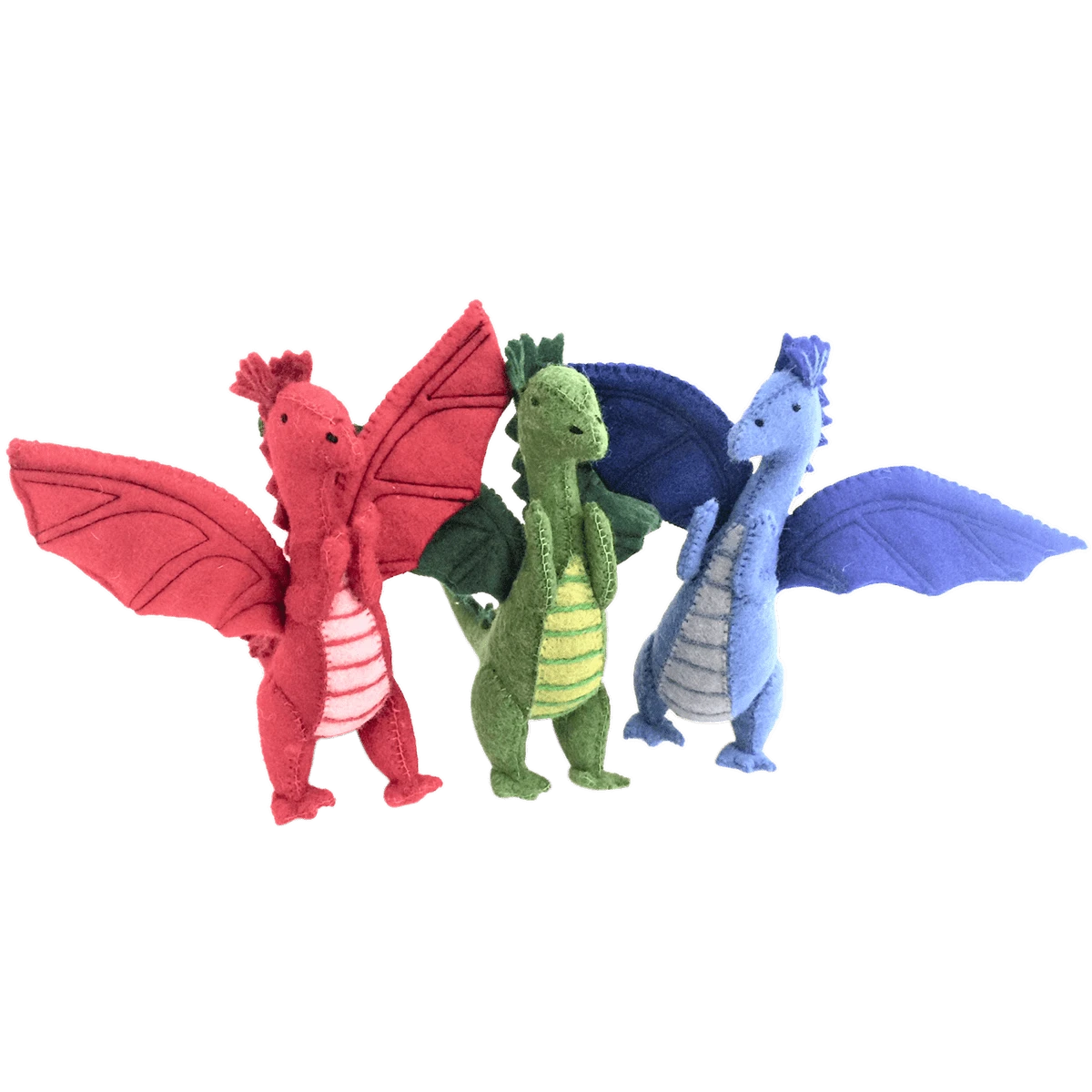 Red, blue and green, 3 strong looking dragons for sturdy play. They stand up, balanced by their tail.