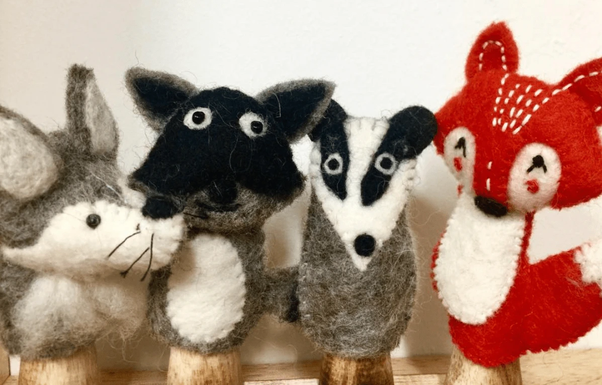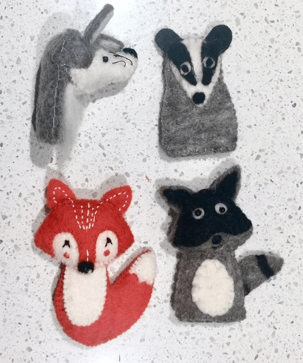 Very cute new finger puppets; a wolf, a raccoon, a fox and a badger.