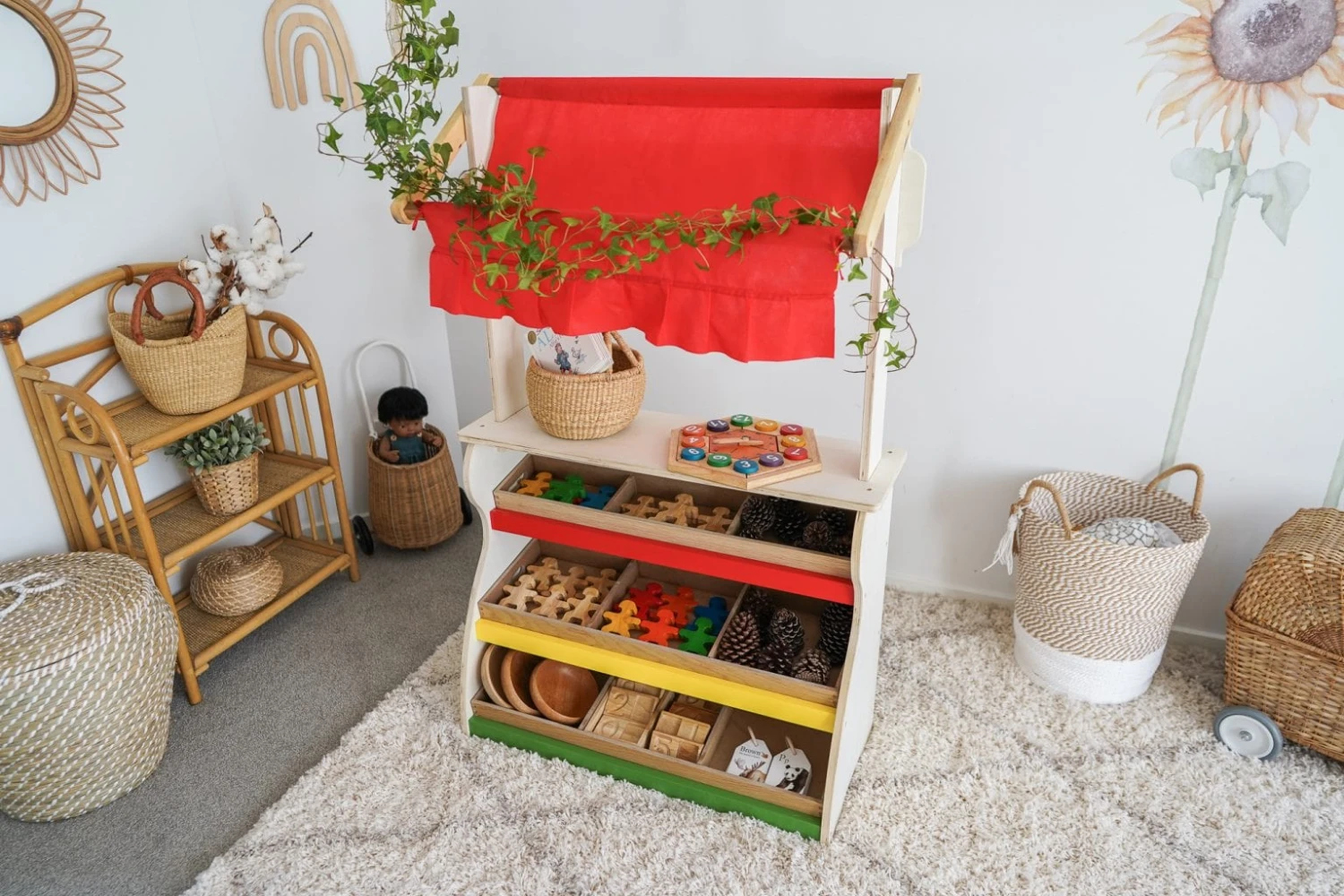 The shop is designed to be good sized and comes with 3 food crates. Turn it around and it’s a puppet theatre
