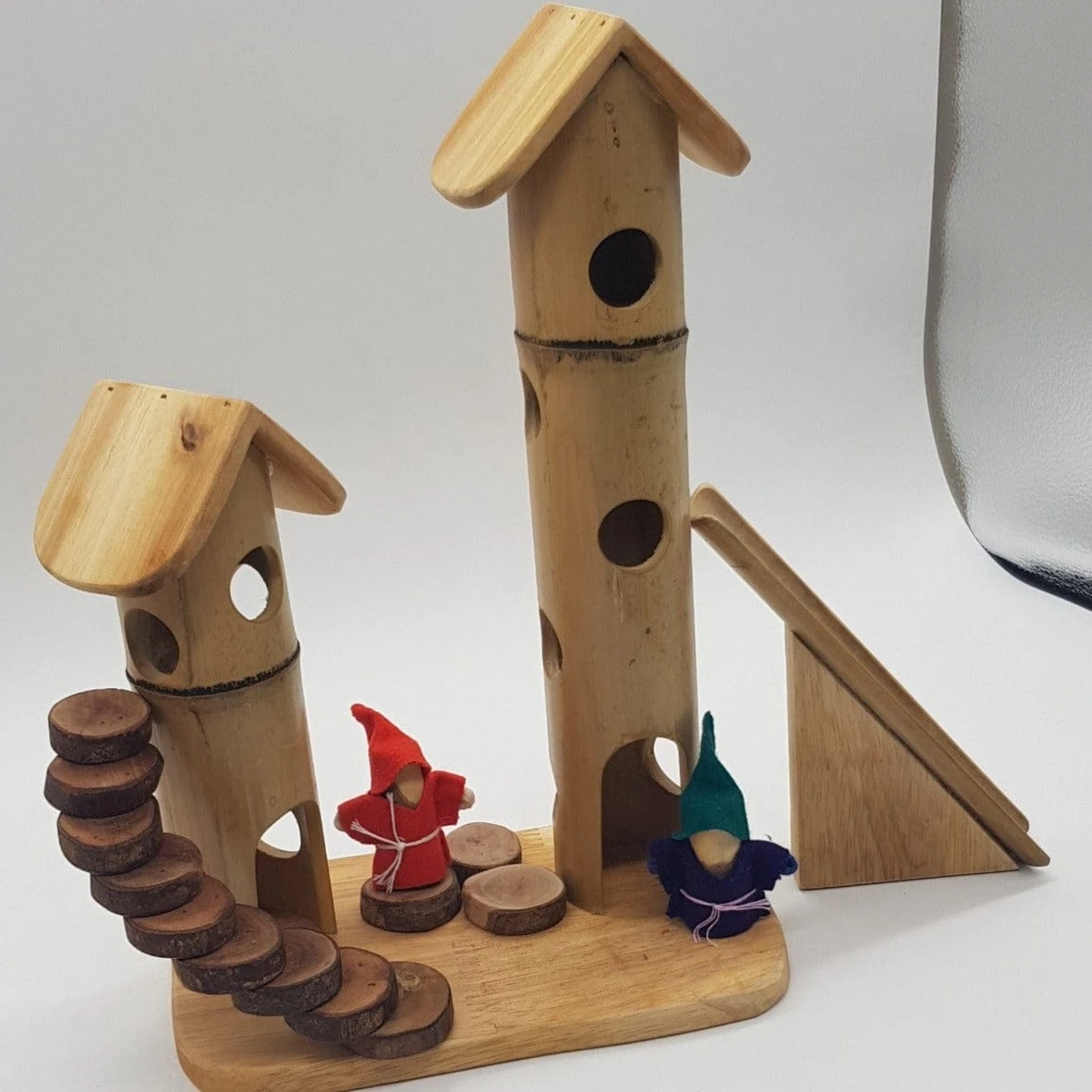 Introducing our Bamboo Gnome Play Set! This delightful addition sparks endless adventures in playtime. Featuring two towers with hollow doors, a charming stairway, and a thrilling slide, it sets the stage for imaginative
