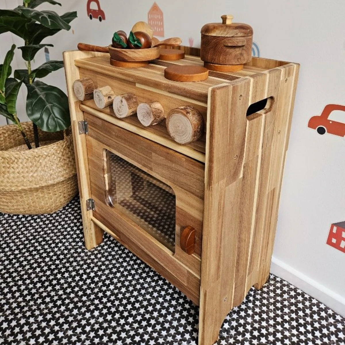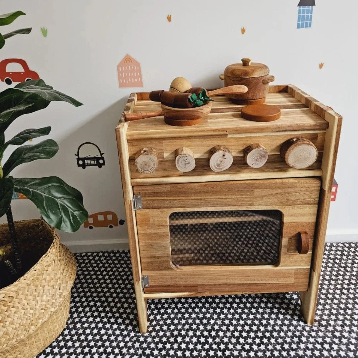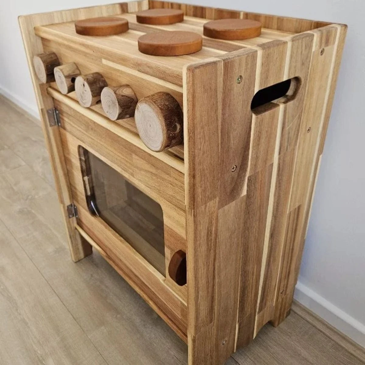 Crafted from timber and meticulously designed to mimic a real stove top, our Natural Wooden Stove prioritizes safety and simplicity. The timber is expertly sanded, smoothed, and finished with beeswax and natural oils, ensuring a child-friendly surface with rounded edges for added safety. Parents can have peace of mind knowing that their childโs playtime is both enjoyable and safe, with no harsh chemicals or rough edges to worry about.
