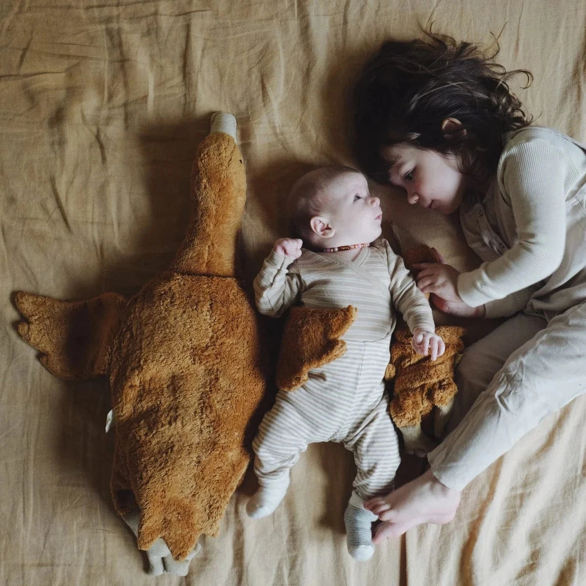 The SENGER Cuddly Small Goose is a soft and cuddly toy that doubles as a weighted toy and a gentle heat bag for children.ย