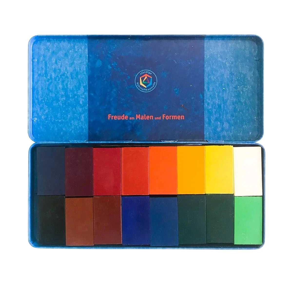 Stockmar Wax Assortment includes: carmine vermilion orange gold yellow lemon yellow yellow green green blue green blue ultramarine blue violet red violet red brown yellow brown white and black.