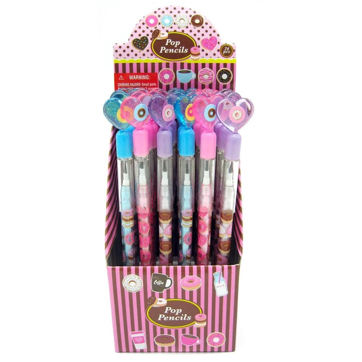 Need to write something but your pencil isn’t sharpened? Well, no need to sharpen pencils anymore with our donut multi-point pencils! Each box contains 24 pencils with 11 leads per pencil. Push the used lead on top and a new lead pops out in front! Perfect addition to your baking or arts and crafts party! Comes in 3 different colors and designs, so you can decide if you want to be a pink or chocolate or just a combination of the two!