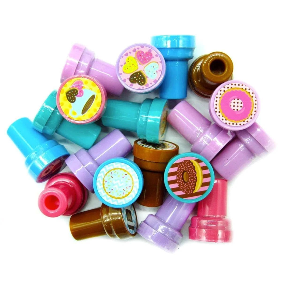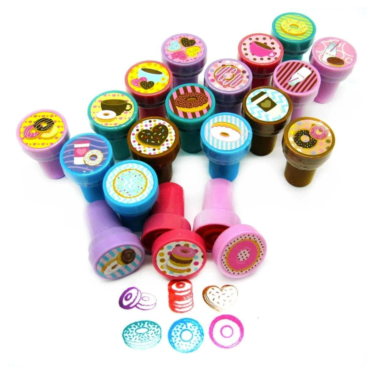 Foodie rejoice! This 24 pcs donut stampers assortment is here to remind you to relax and have a coffee break! These colorful stampers will make a perfect addition to any invitations for your party. Comes with 24 different designs, containing different kinds of donuts, coffee, and the combination of donuts and coffee. These stampers are perfect for creating your own greeting cards, scrapbooking and decorating stationery. Have this stamp assortment at home, in the classroom, or in art class! Our stamps are non-toxic, lead-free, have passed all CPSIA and ASTM testing. Safe for children to use. 1.5 inches tall, 1 inch in diameter.