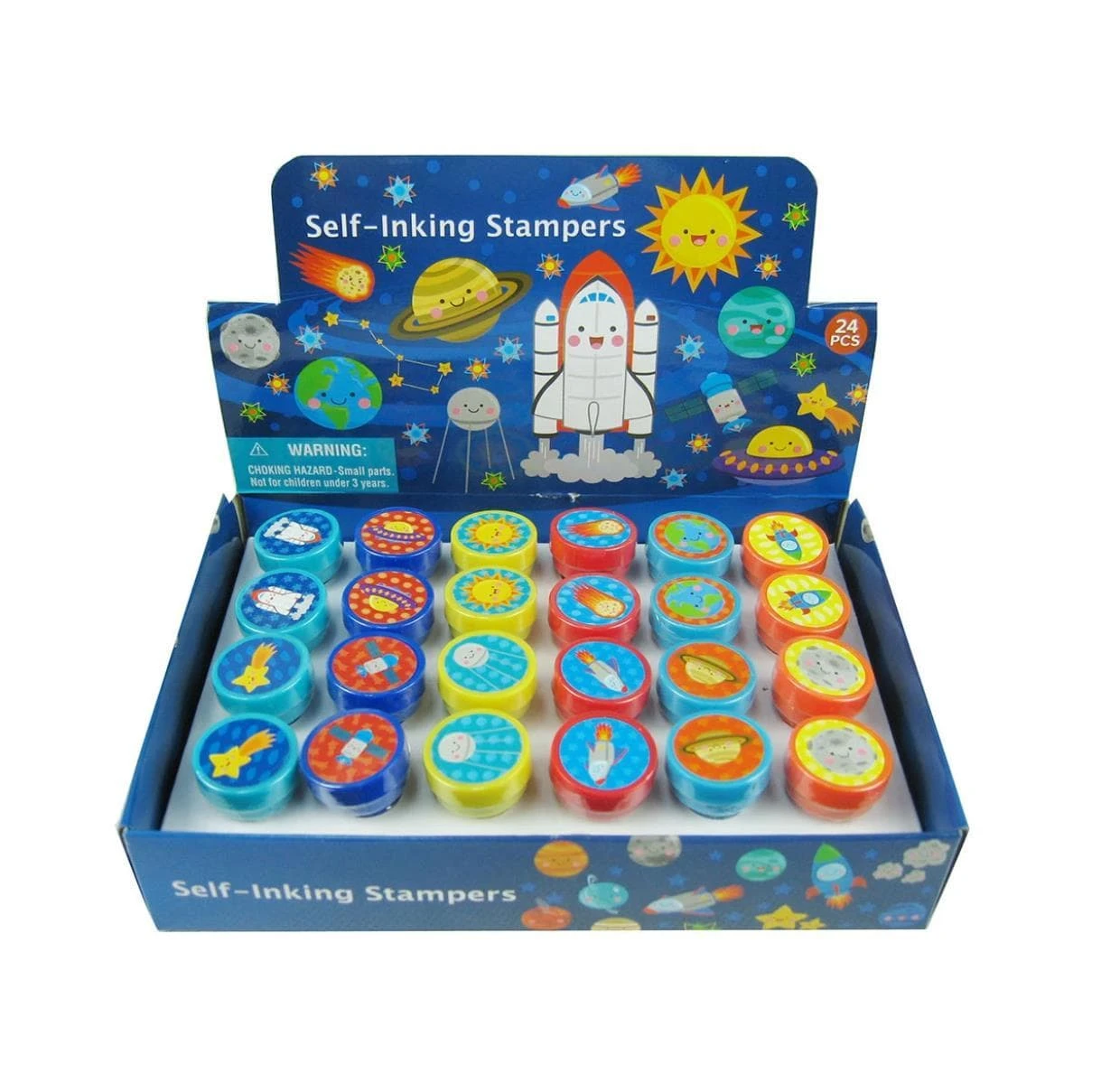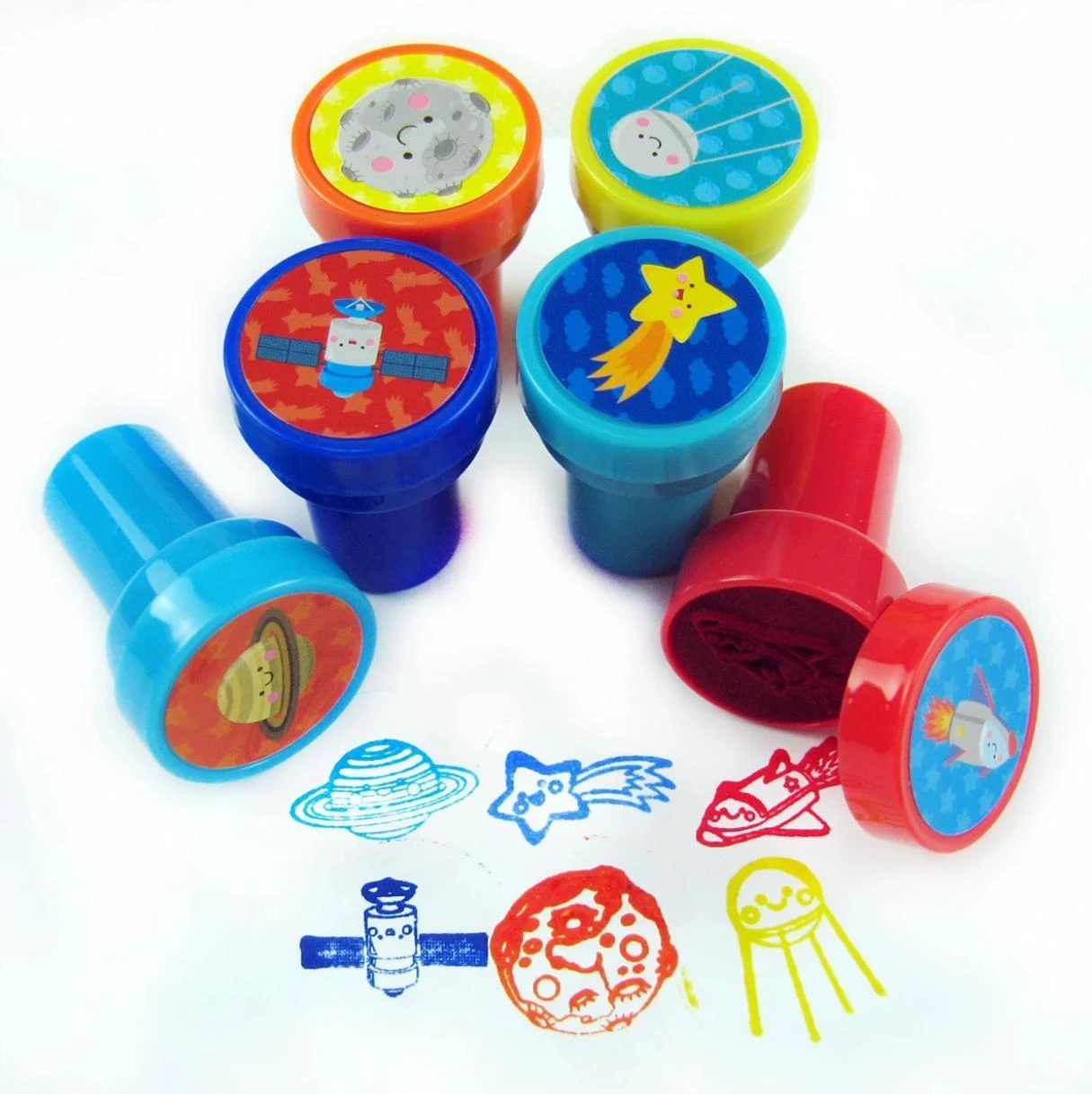 Our outer space stampers will brighten up any party favor bag! These stampers are also great for school projects, to create your own greeting cards, scrapbooking and decorating stationery. Have this stamp assortment at for a trip to the planetarium, for home, in the classroom, or in art class! Our stamps are non-toxic, lead-free have passed all CPSIA and ASTM testing. Safe for children to use. 1.5 inches tall, 1 inch in diameter