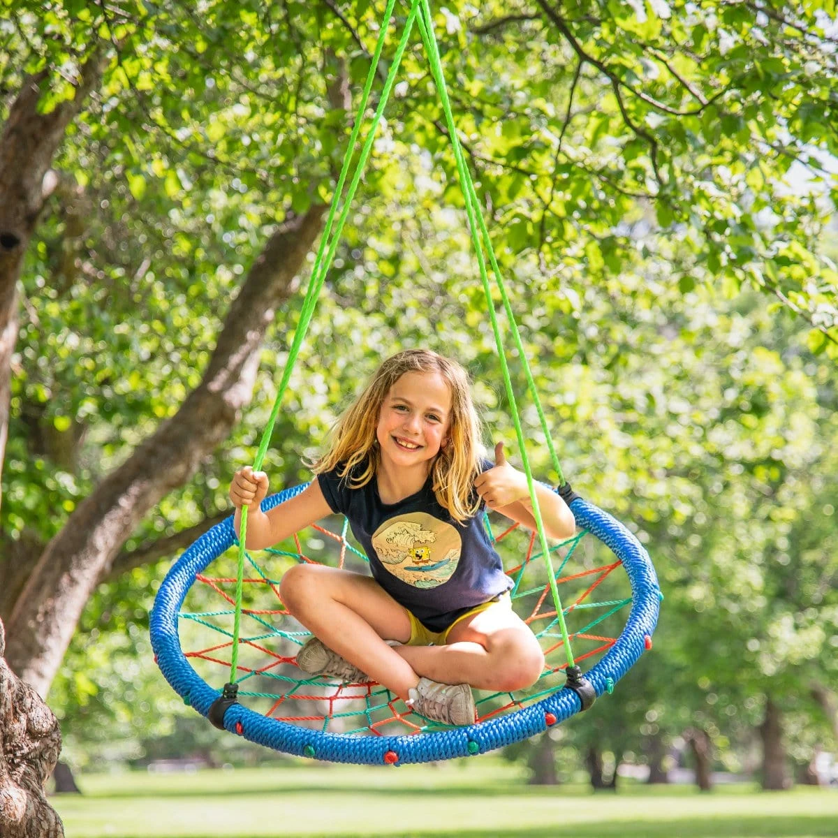 POPULAR BEST SELLER: Attractive colorful woven dreamcatcher pattern creates an enticing swing for both kids and adults! Simple snap together assembly. Made with a core steel ring, heavy dusty adjustable PE UV resistant ropes, hanging carabiners.
