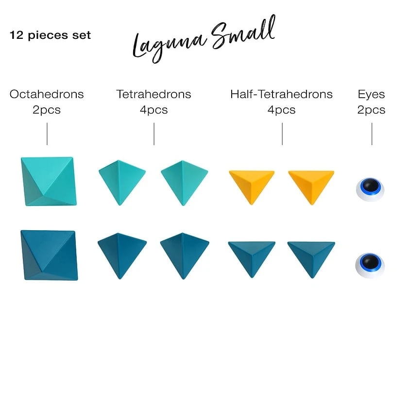 2 octahedrons, 4 tetrahedrons, 4 half-tetrahedrons, 2 eyes (in total 12 pieces) + Leaflet.